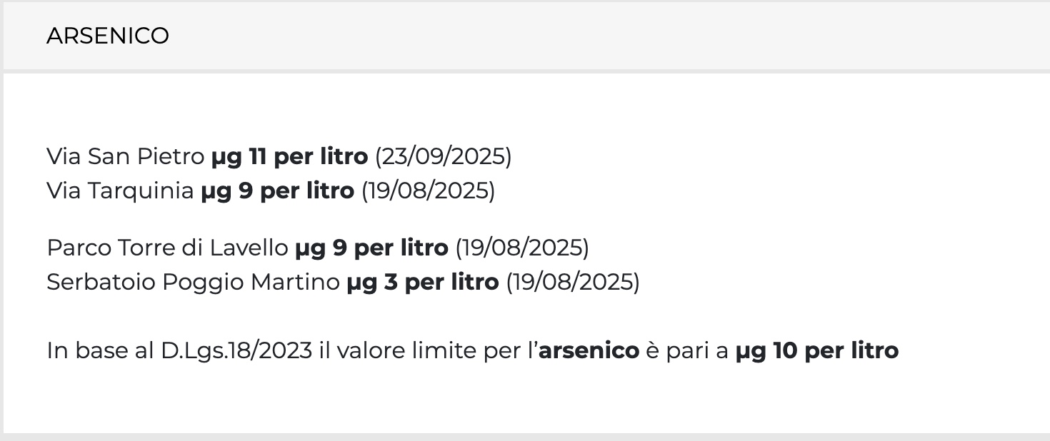 La decisione arriva dopo le analisi dell’Asl di Viterbo, che hanno segnalato valori di arsenico oltre i limiti di legge: 11 µg/l alla fontana di San Pietro e 12 µg/l all’uscita dell’impianto Quercette, a fronte del massimo consentito di 10 µg/l. Fino a quando la società Talete non interverrà con le necessarie misure correttive, l’acqua potrà essere usata solo per scopi tecnologici e per l’igiene domestica.